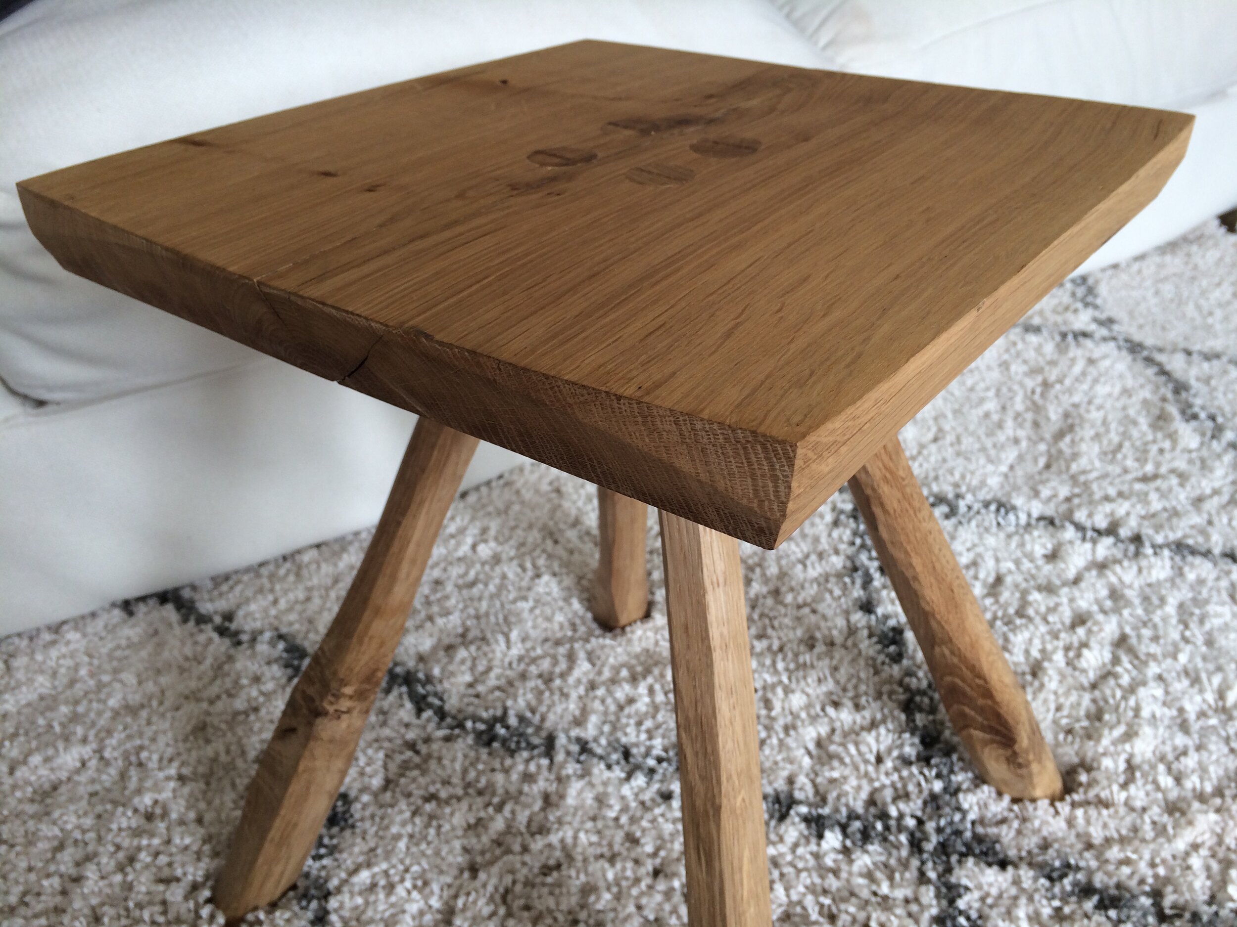 Handmade oak stool table with hand drawn legs and wedged tenons through top